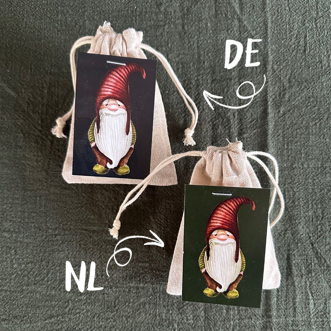 Verpakking: jute zakje met kaartje (wichtelgroet)