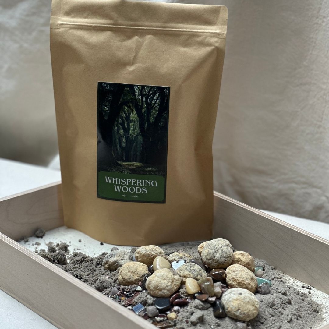 Sensory play draait om ontdekken, voelen en experimenteren – en dat is precies wat kinderen in de Whispering Woods Pouch ervaren. In het zand liggen bijzondere vondsten verborgen die doen denken aan de fluisteringen van bomen, dieren en natuur. Elk steentje en elk object vertelt een klein verhaal, als je maar goed luistert.