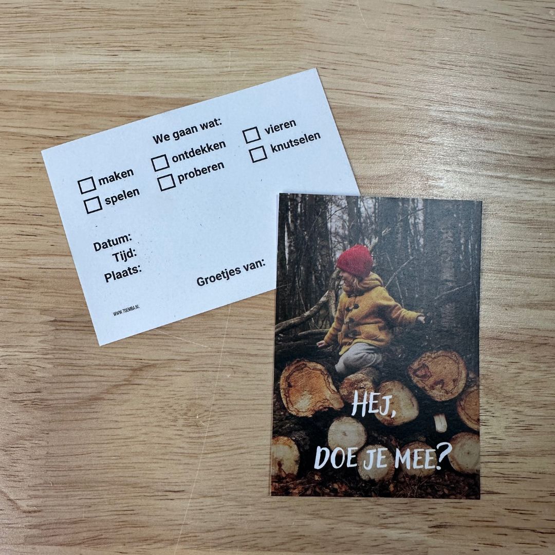 Wil je iets maken, knutselen of vieren? Met deze vrolijke kaartjes nodig je iemand uit om samen iets leuks te gaan doen. Voorop de kaart zie je een meisje in het bos. Achterop kruis je makkelijk aan wat jullie gaan doen – en waar & wanneer.
